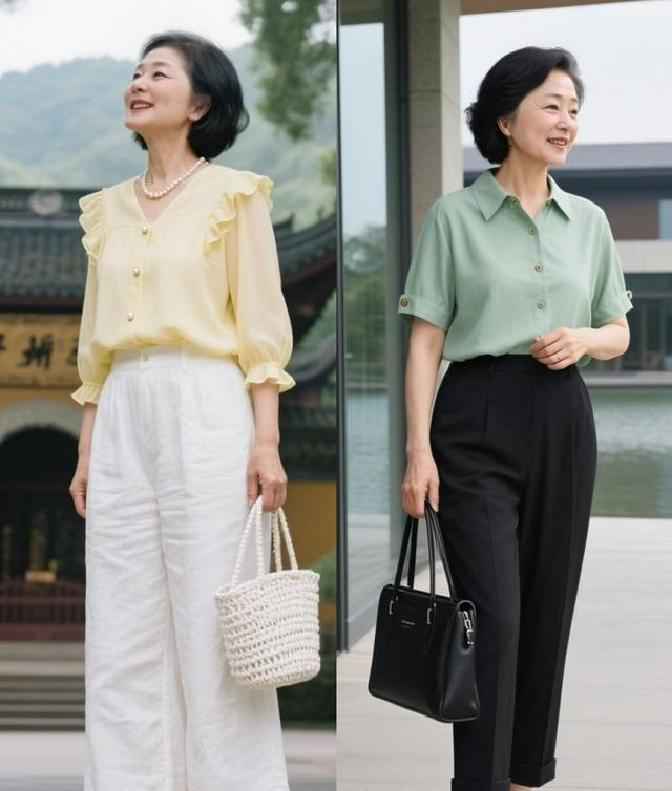 微风吹起她的灰白短发,她穿了一件简单的米色衬衫,搭配雾蓝色阔腿裤,脚上的乐福鞋虽然旧了,但擦得锃亮。