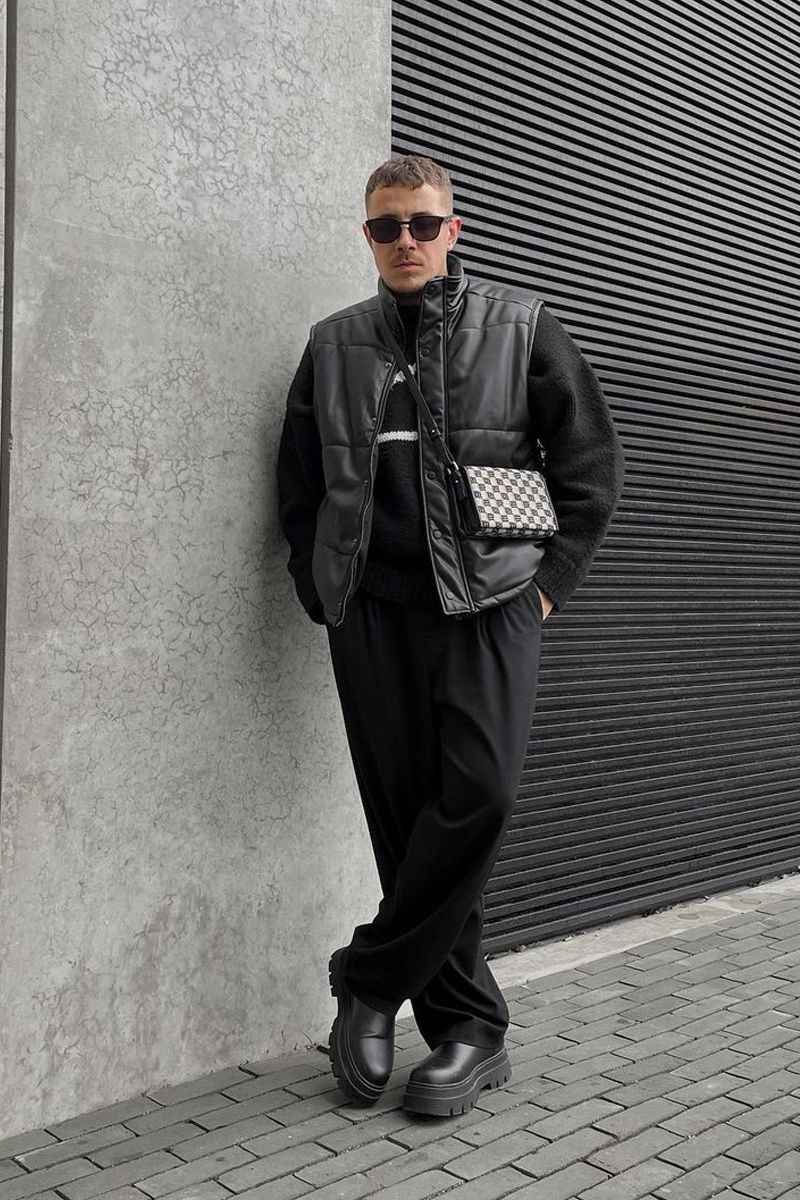 还可以在款式上玩点花样。比如用直筒裤搭配皮鞋,简单又帅气,黑色也能穿出洋气感,让整体造型更有型,不会显得老气。