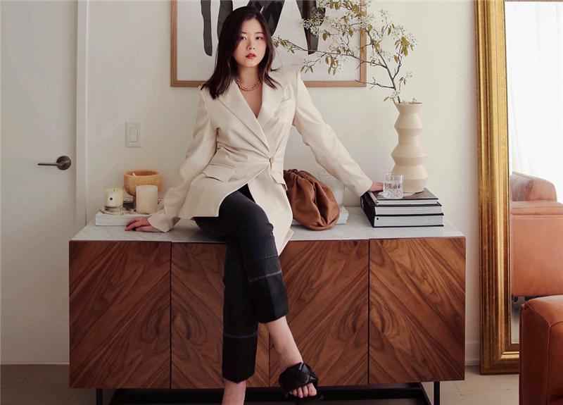 像博主这样用黑色西裤配收腰西装,既干练又时髦,