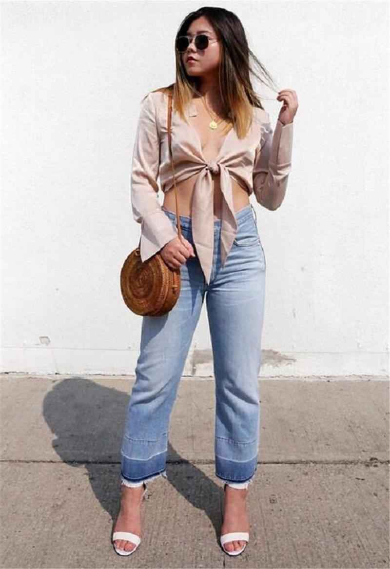 用九分直筒牛仔裤配短款上衣,效果意外地好。