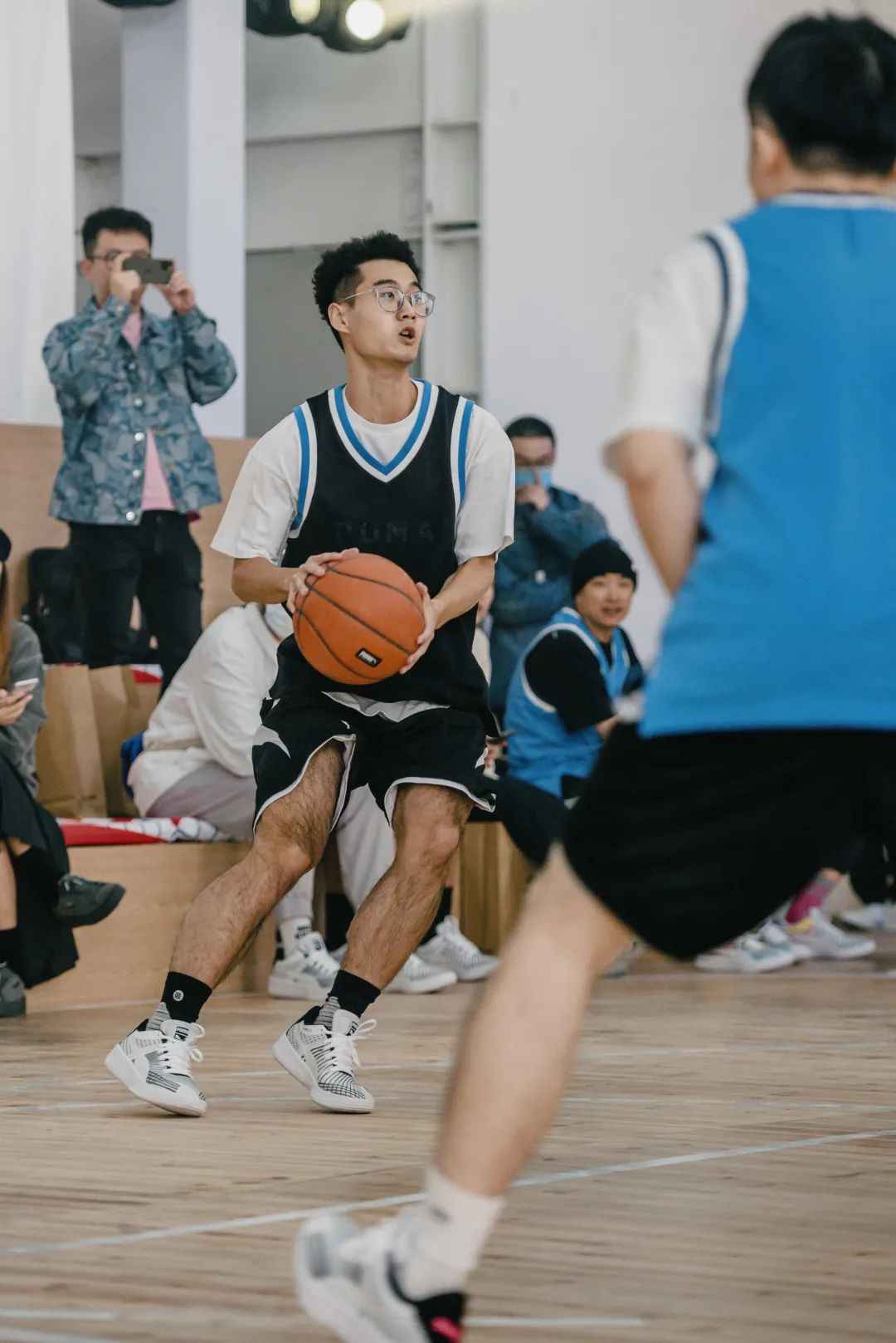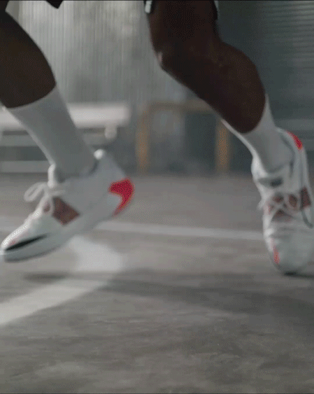 外底纹路是纵向波浪设计,初期在潮湿地面上抓地一般,后期好转,但做不到急停急起,总有点制动距离。测试撤步投篮时,我得调整脚步来弥补这点不足: