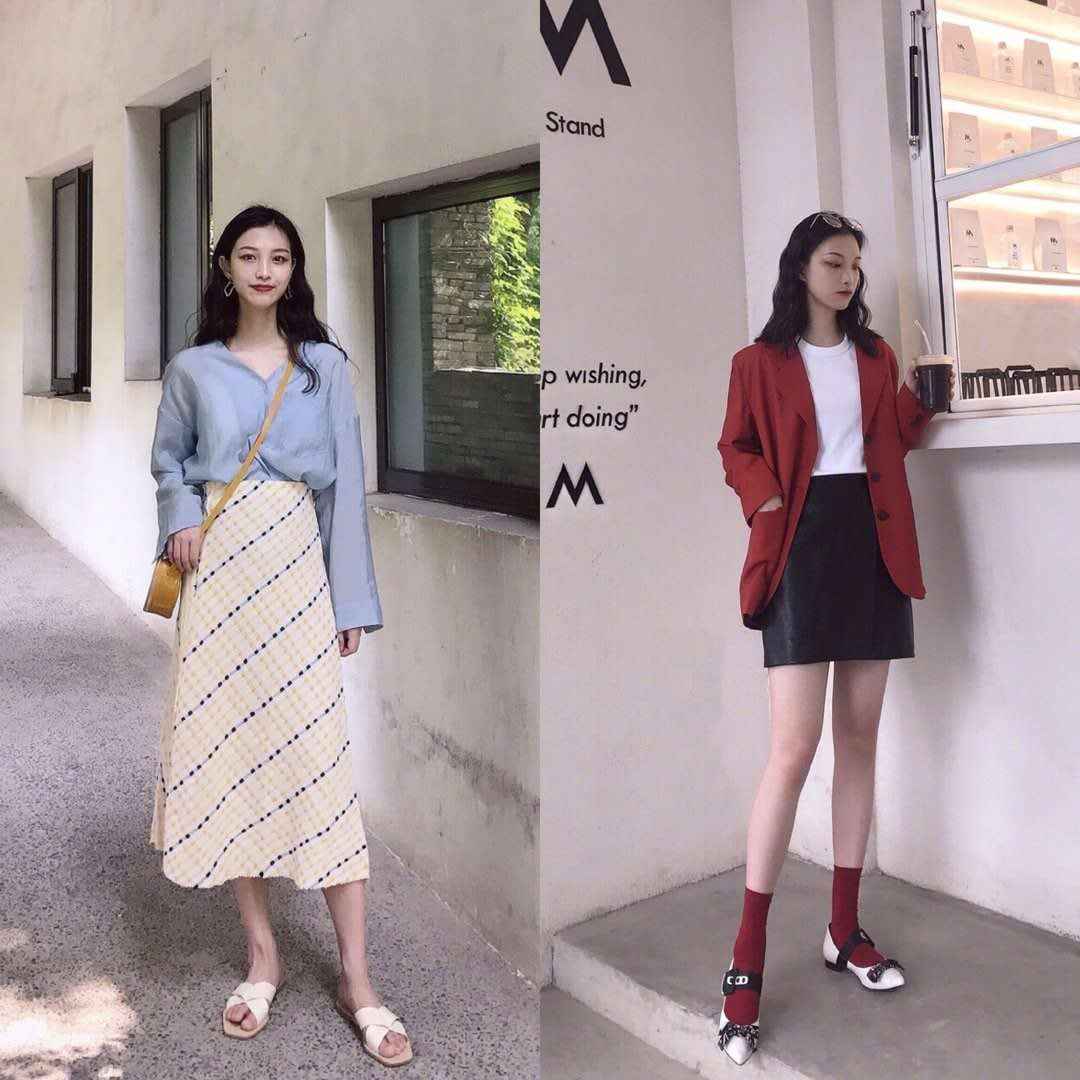 ▲左边这套蓝色衬衫配长半裙,清爽又优雅,蓝色系一直是优雅风的常客,搭上米色裙子,看着就舒服。右边红色西装内搭白T恤,再加一条皮裙,既有知性味又不失俏皮。