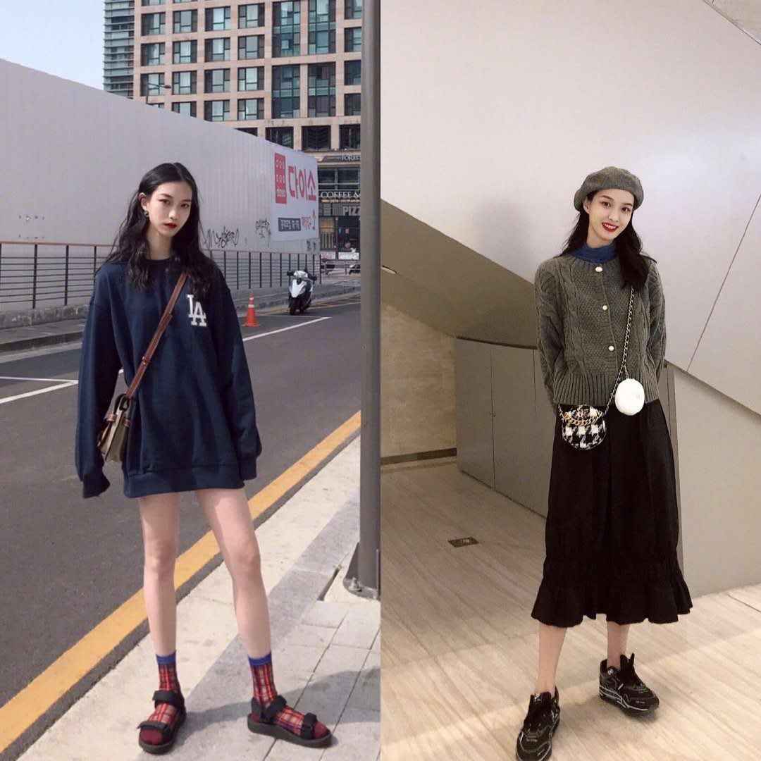 ▲优雅风也能融入学院感,比如左边紫色卫衣配百褶短裙,青春活力满满。右边蓝色毛衣配阔腿裤,慵懒又休闲。