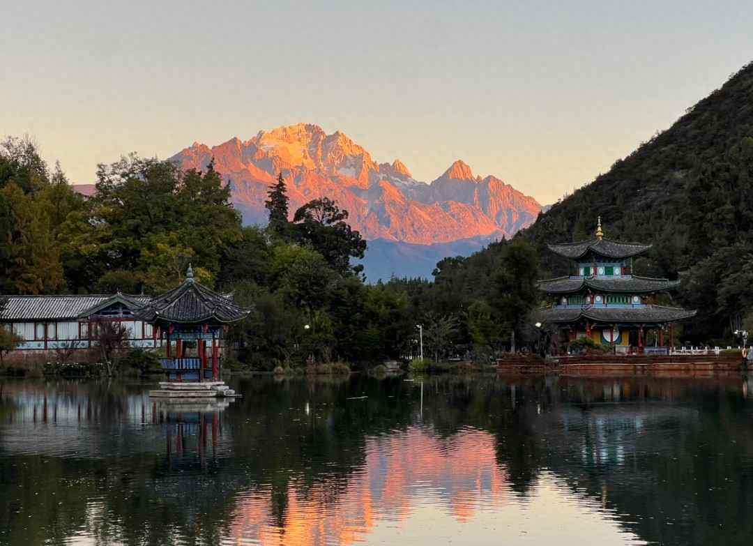 每年10月中旬到第二年3月,是看玉龙雪山“日照金山”最好的时候。早上7点左右,黑龙潭公园的锁翠桥前面就挤满了游客和本地人,大家都想抢拍这个精彩瞬间。慢慢升起的太阳把雪山染成金光闪闪的颜色,和公园里的老建筑、湖水搭配得恰到好处。从郑州来的游客付雷说:“专门为这个来的,拍出来的照片太美了。”湖南游客赵欢也兴奋地分享:“第一次亲眼看到‘日照金山’,感觉特别难忘。虽然早上冷得发抖,但阳光照在雪山上的那一刻,觉得一切都值了!”