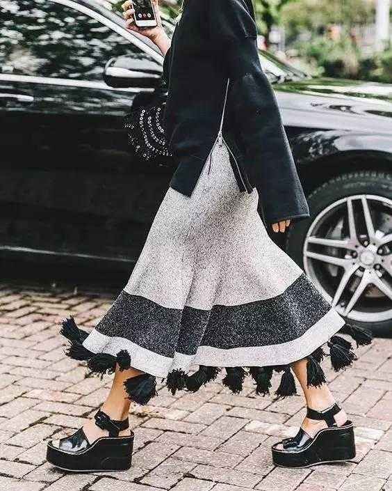 带点跟的鞋子,无论是低跟乐福鞋、踝靴还是中筒靴,都能悄悄拉长腿部线条,让你在穿着厚重衣物的冬天依然显得挺拔利落-1。如果裙子是深色系,鞋子可以选择同色系,这样能在视觉上无限延伸腿长-1。今年特别流行中长裙搭配袜子和乐福鞋,学院风十足又很酷-10。比如,用一条灰色百褶中长裙,搭配黑色袜子和一双厚底乐福鞋,上身随便穿件宽松毛衣,就是那种毫不费力的时髦感-10。
