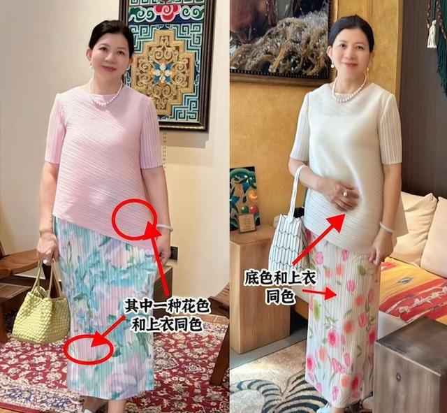 38岁女人夏装搭配方案:一百褶长裙很适合春夏,配上宽袖上衣很精致。搭运动鞋有点休闲感。二黑白配色的小碎花裙,简单又时尚。