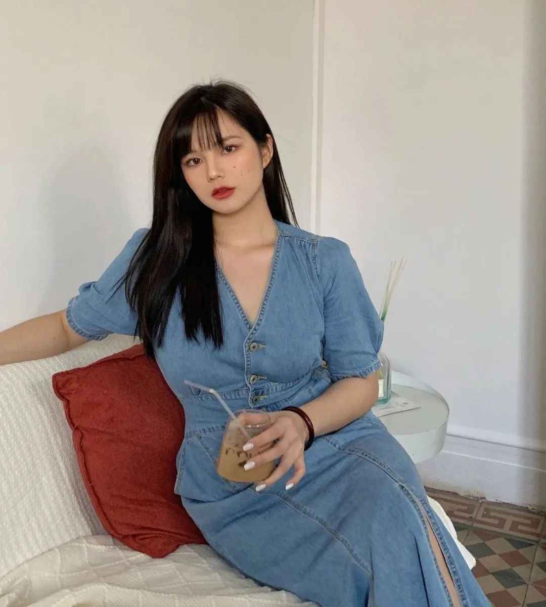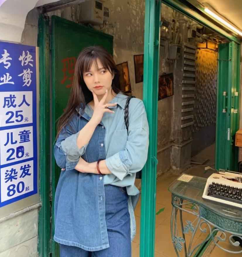 彦如就很爱穿拼色上衣,比如下面这种双色拼接的牛仔衬衫,能让上半身线条纵向延伸,直接视觉上变窄。