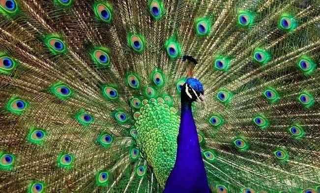 大部分人第一眼看见孔雀,尤其是那雄孔雀开屏的时候,满脑子只剩下“五彩斑斓”“眼花缭乱”这种词儿。确实,它那身羽毛主打一个蓝绿色调,尤其在阳光下,脖子和前胸那片羽毛泛着金属光泽的宝蓝色,贵气逼人。而开屏后那巨大的尾屏,上头一个个“眼状斑”,更是集大成者:圈圈外边儿是亮闪闪的青铜绿,中间过渡到金棕色,最里头那“瞳孔”又是深深的宝蓝色。你远远望去,可不就是一片璀璨的、以蓝绿为主的华丽锦缎嘛!这是人们对“孔雀什么颜色”最直观、也最表面的印象。
