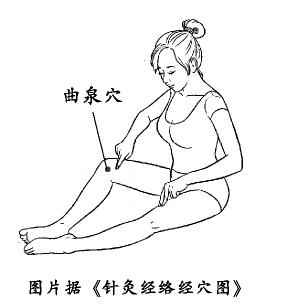 取穴时弯曲膝盖,膝内侧横纹头上方凹陷处就是曲泉穴。