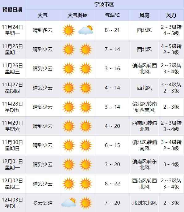 因为11月27日和29日后还有冷空气补充,新的一周(11月24日到30日)宁波最低温基本在3℃到4℃徘徊。早晚出门的朋友,一定要穿暖和点。