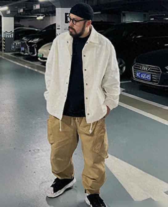我改用“上浅下深”的层次法:上身奶油白卫衣,下身军绿工装裤,肩膀瞬间变宽三厘米,裤管堆叠出体积感。