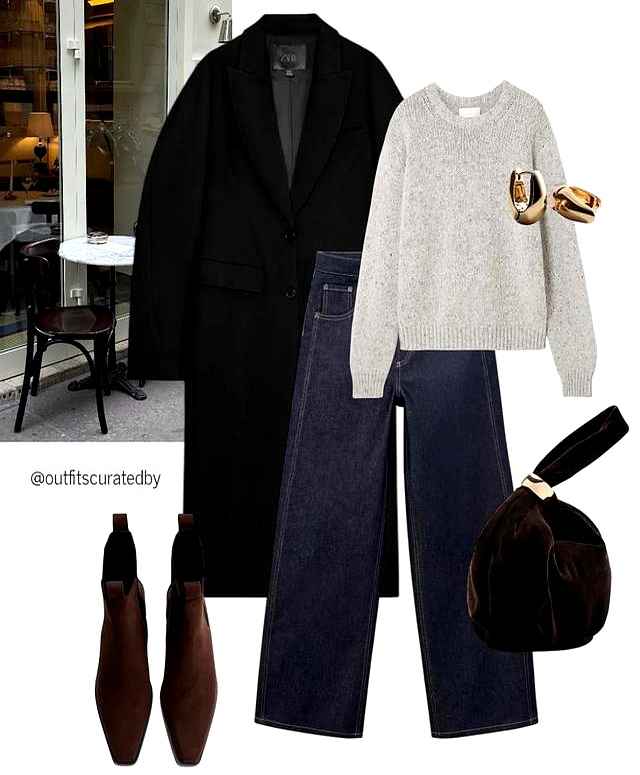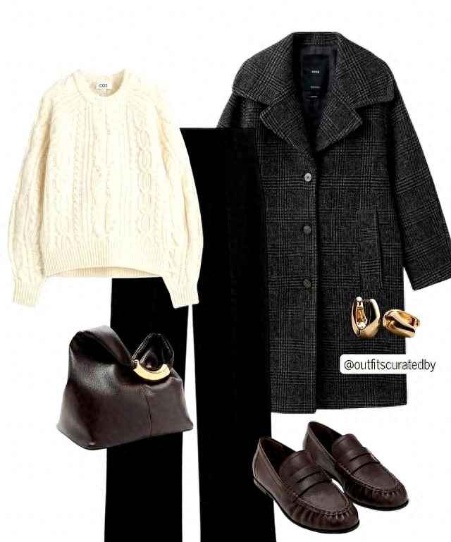 第一套,是儒雅学院风。用一件深灰色呢子大衣,简单大方还显档次,配上粗针白色毛衣和直筒西裤,整个人看起来稳重又有书生气。乐福鞋是点睛之笔,舒服又精致,适合上课或正式场合,让你轻松穿出随性高级感。