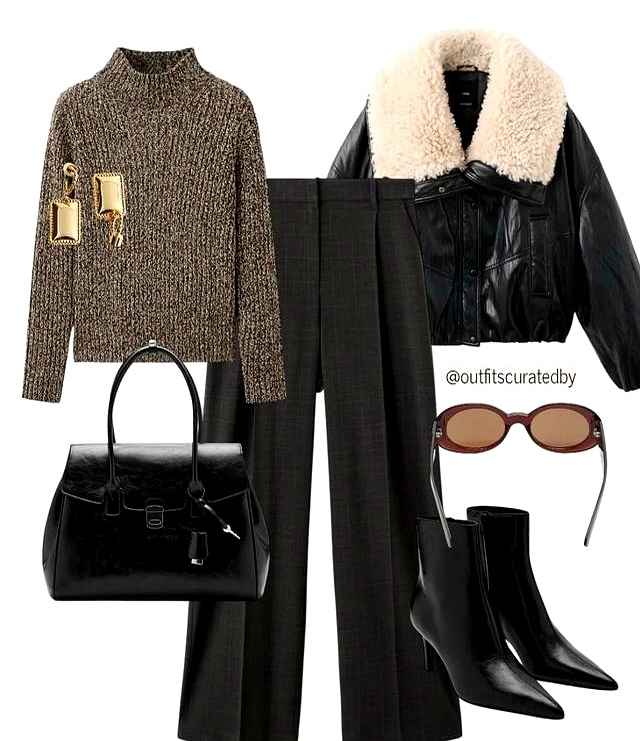 第二套,温柔又利落。短款皮衣加上毛茸茸的领子,酷炫中带点温暖,高领毛衣选咖色,保暖好搭配。细跟短靴走路不累脚,但一穿上立马提升气场,适合周末逛街或约会,低调中展现个性。