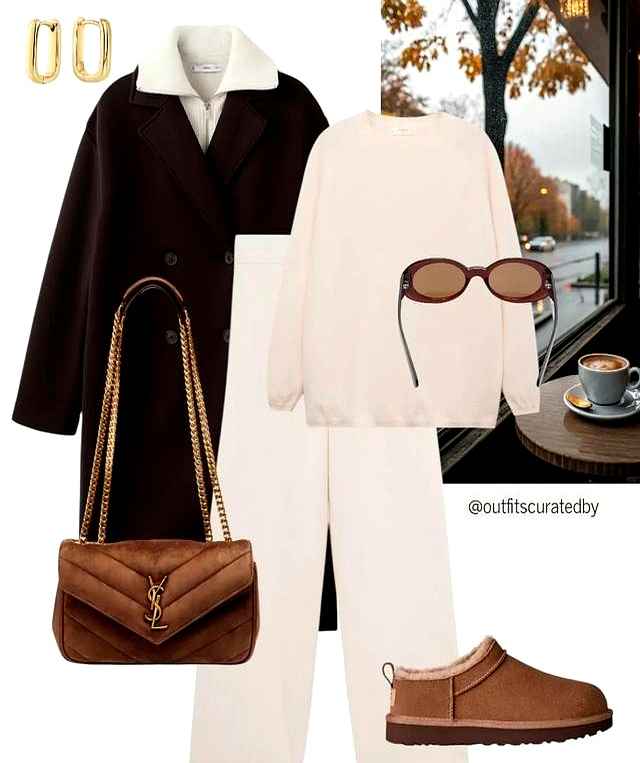 第三套,休闲优雅范。廓形咖色大衣套在米白色卫衣和卫裤外面,舒服又时髦,轻松融入校园生活。这种搭配看似随意,实则显品味,尤其在深秋阴天里,让你成为人群中的暖色调焦点。