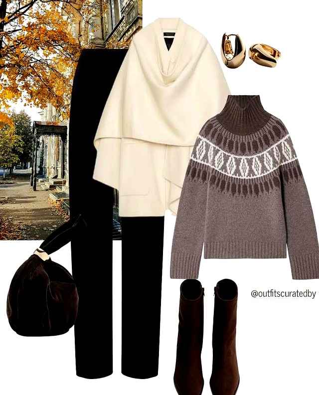 第四套,几何结构风。建筑感外套设计立体,配上几何图案的高领毛衣,层次感瞬间拉满。像大牌的不对称剪裁,适合想突出个性又不想太夸张的同学,加个闪亮耳饰,时尚感爆棚。