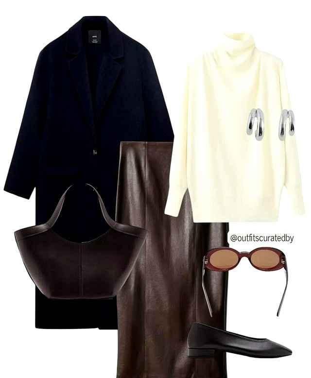 第六套,时髦大气款。深海蓝大衣搭配奶白色羊毛毛衣和皮质半裙,亮眼又优雅,适合想穿出高级感的同学。加点金属配饰,整体更吸睛,让你在校园里脱颖而出。