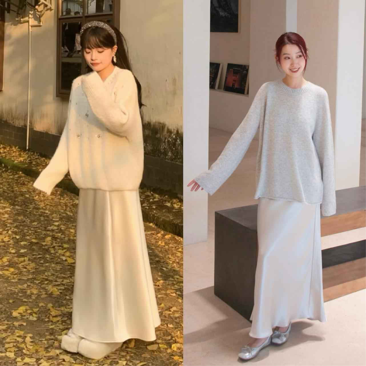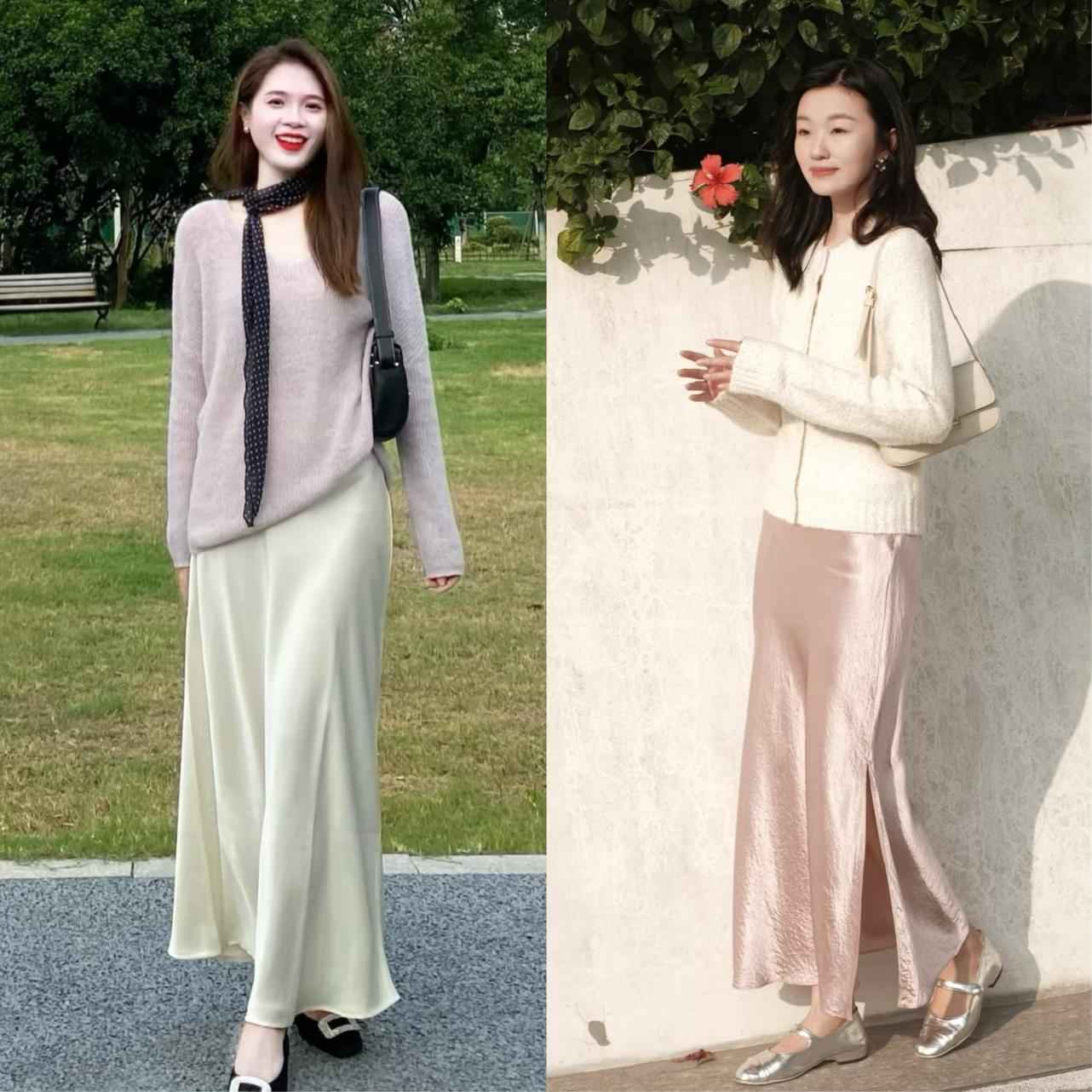 想穿出成熟优雅的秋日feel,毛衣和缎面裙是绝配。缎面裙垂感好,能突出身材曲线,走路时裙摆轻盈,显得身姿曼妙。尤其是过膝长度的缎面裙,看起来更大气,配上一双浅口鞋,女人味自然流露。
