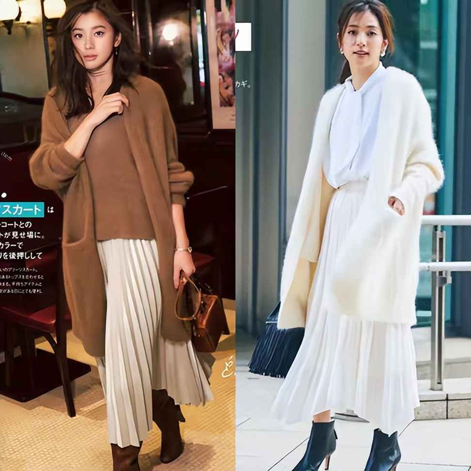 中长款毛衣开衫很适合高个子女生,能遮住腰腹赘肉,穿出慵懒感。穿着时敞开外套,内搭同色系打底衫和高腰百褶裙,瞬间显得轻盈有型。