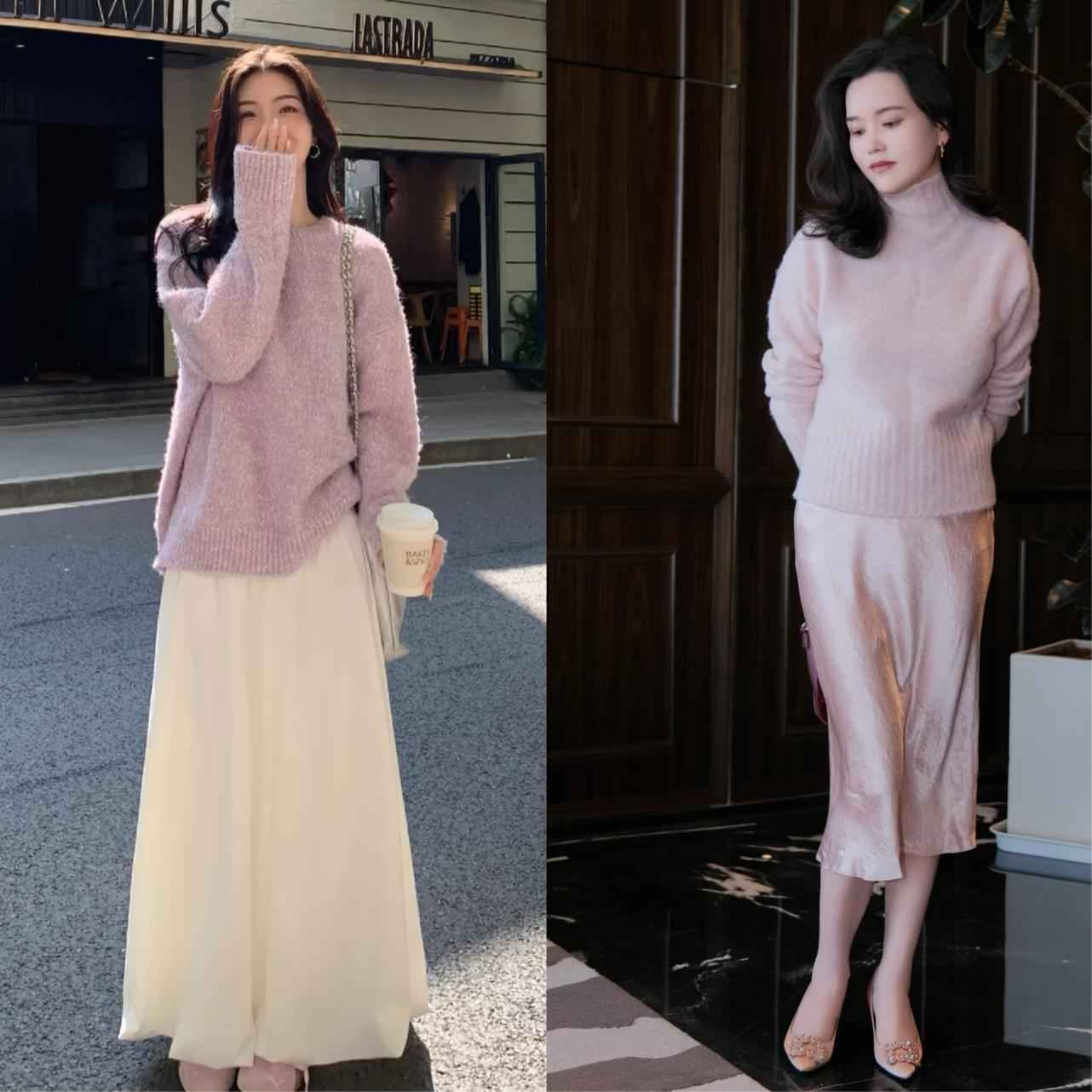 秋冬季节别总穿深色,浅色系搭配更吸睛。比如低饱和度的马海毛毛衣自带高级感,搭配同色系缎面裙,上宽下窄的版型显高显瘦,再穿一双小白鞋或芭蕾鞋,精致中带着轻松感。