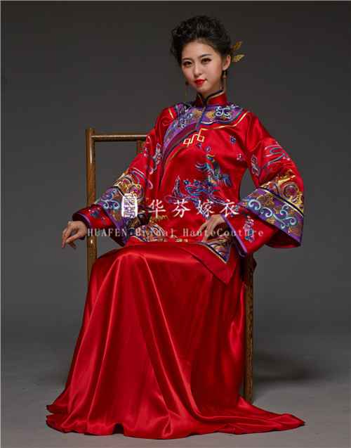 如果你钟情于古典和仪式感,那么明制汉服(如凤冠霞帔、马面裙搭配长袄)或龙凤褂是首选。龙凤褂根据刺绣密度分为褂皇、褂后、大五福、中五福、小五福,金银线覆盖越满越显华贵-5。这类款式气场强大,最适合庄重典雅的中式婚礼。