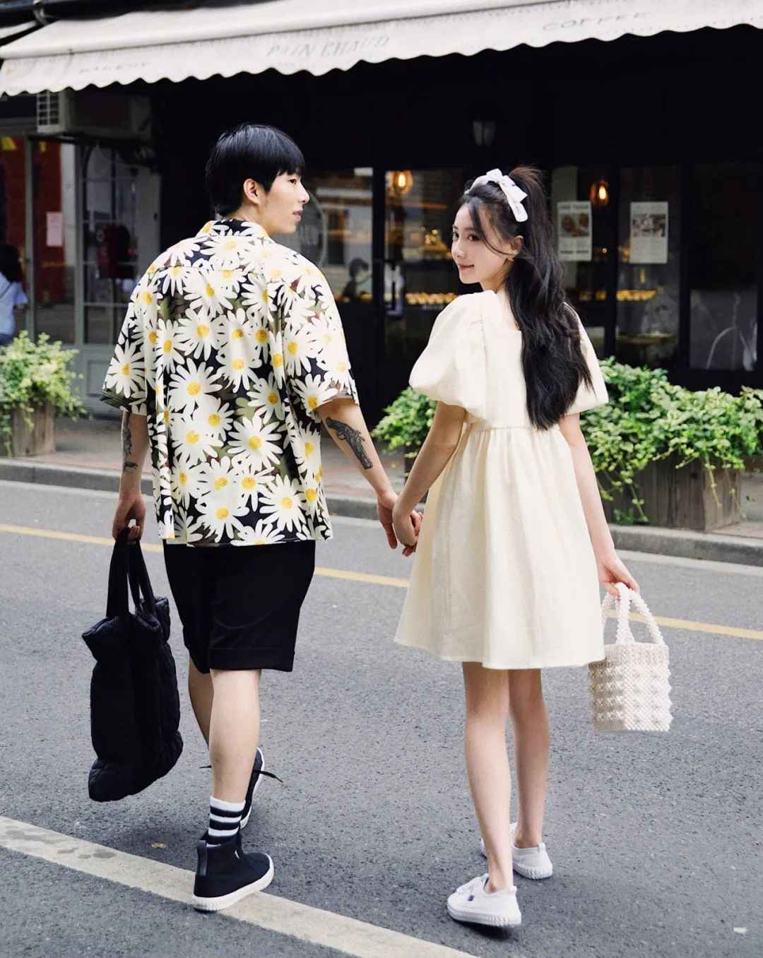 男衣女裙是现在流行的情侣装搭配,之前讲过不难学,只要在颜色和风格上呼应就行。比如这组用了清新的黄色和雏菊元素,既有夏日感又抢眼。