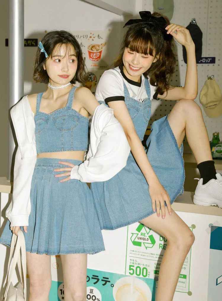 有句话形容闺蜜:我只想和你撞衫。但得选对款式,避免谁丑谁尴尬。这种短吊带配A字百褶裙的牛仔套装,谁穿都是少女和辣妹的结合体,而且经典不过时,放心穿。