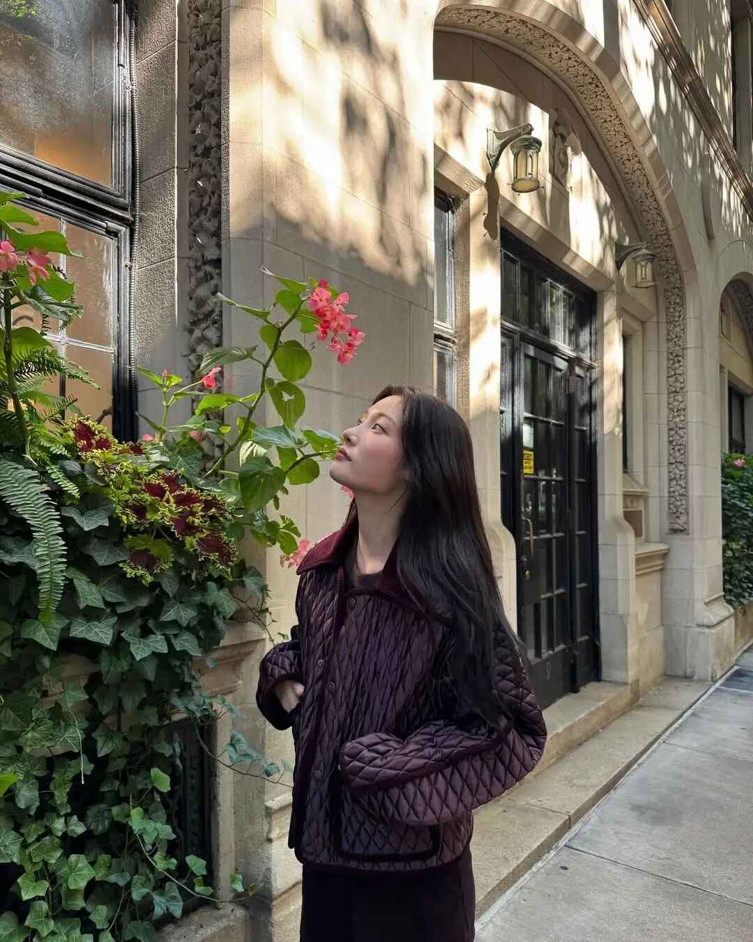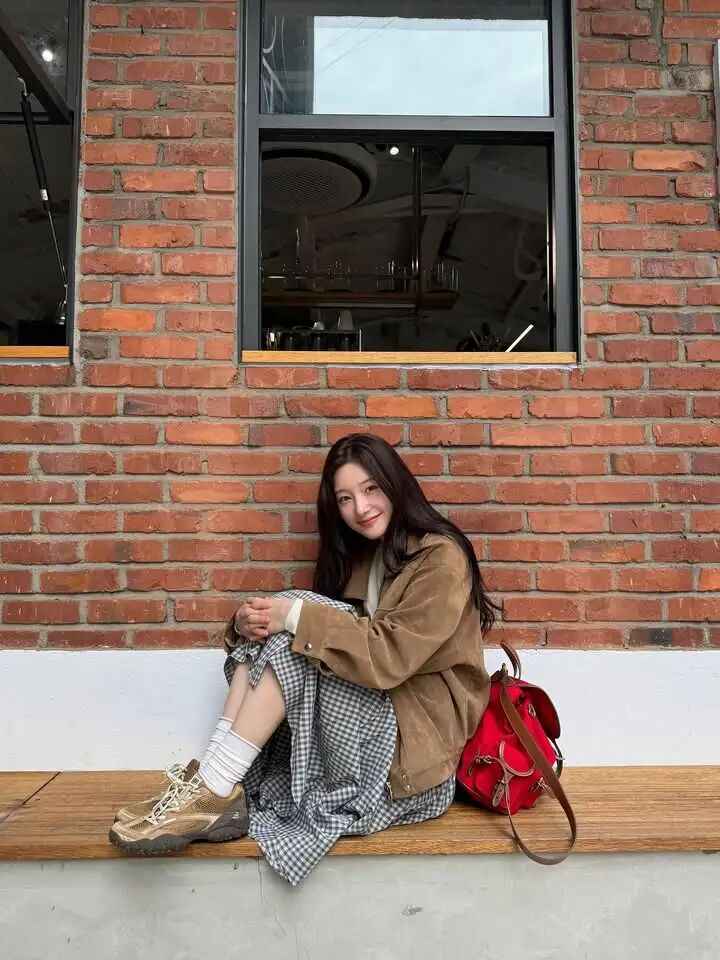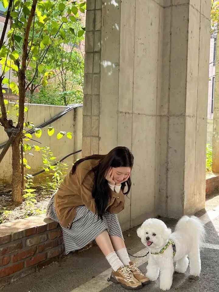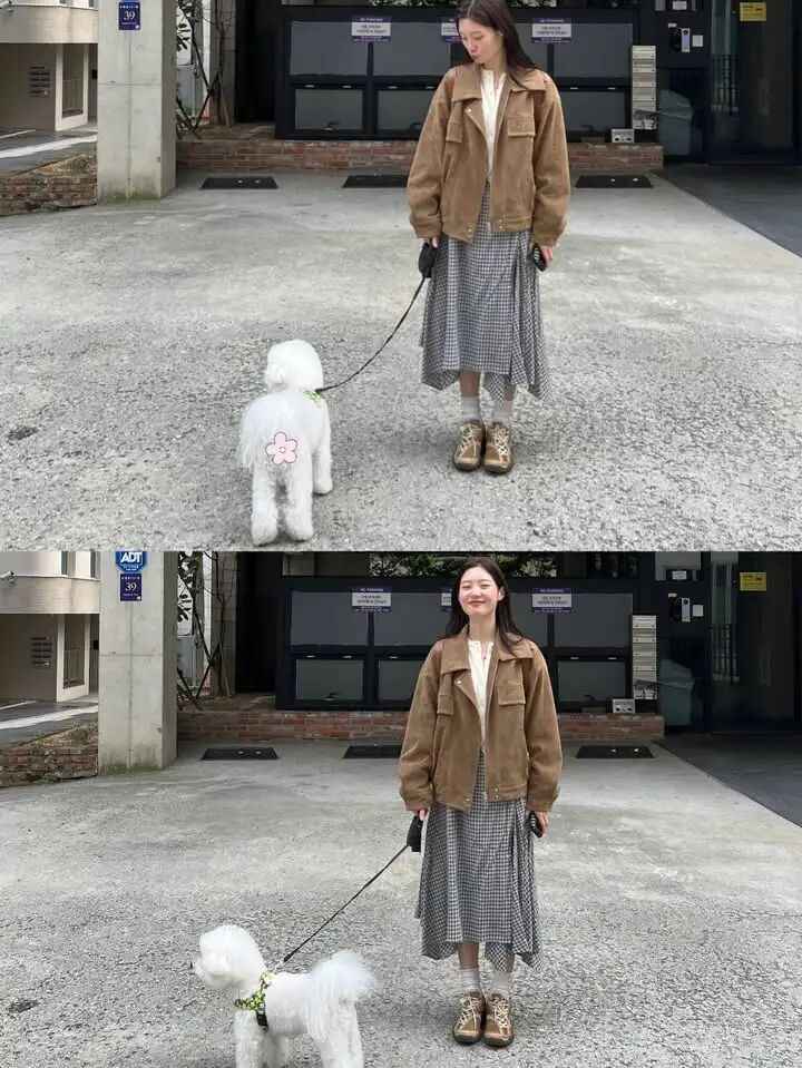 天气好的时候,带上狗狗一起出门逛街吧。郑采妍这身咖啡色外套配黑白格纹裙,既自然又带点复古调调。抓拍的照片里,她的表情超自然,感染力十足,看起来舒服又不做作。