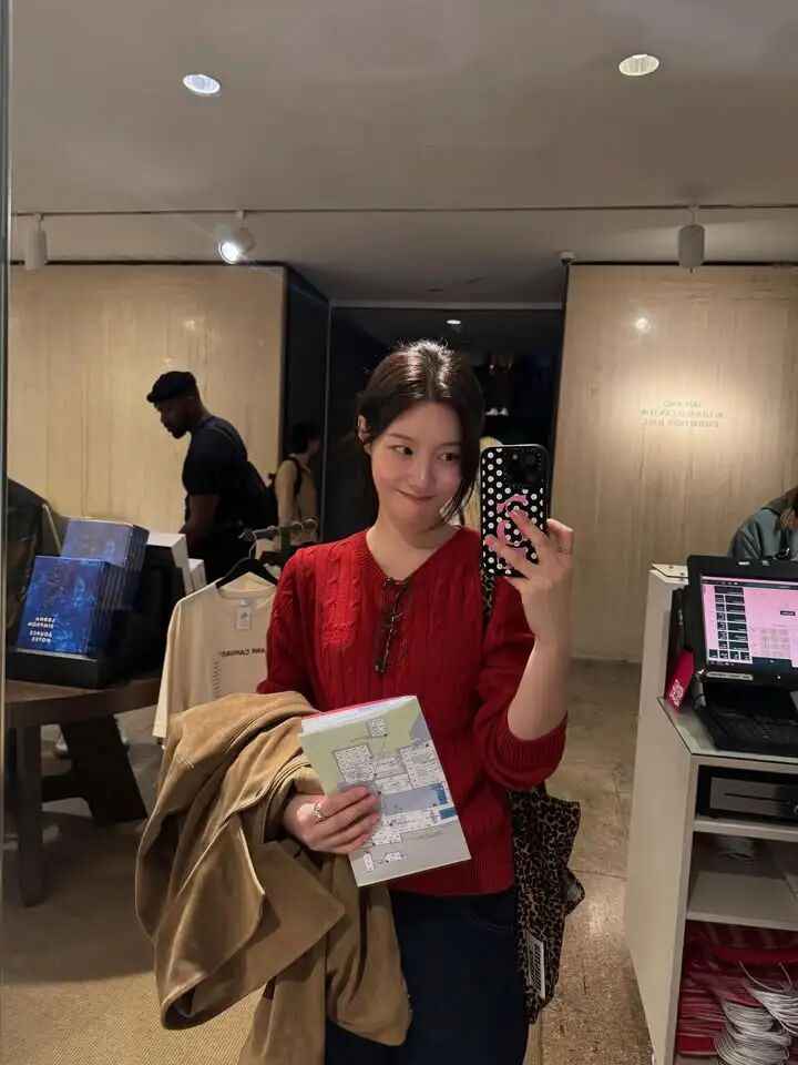 红色针织衫的暖色调带来冬日的温馨感,日常逛街时用手机对镜自拍,强化了生活气息,让人很有代入感。