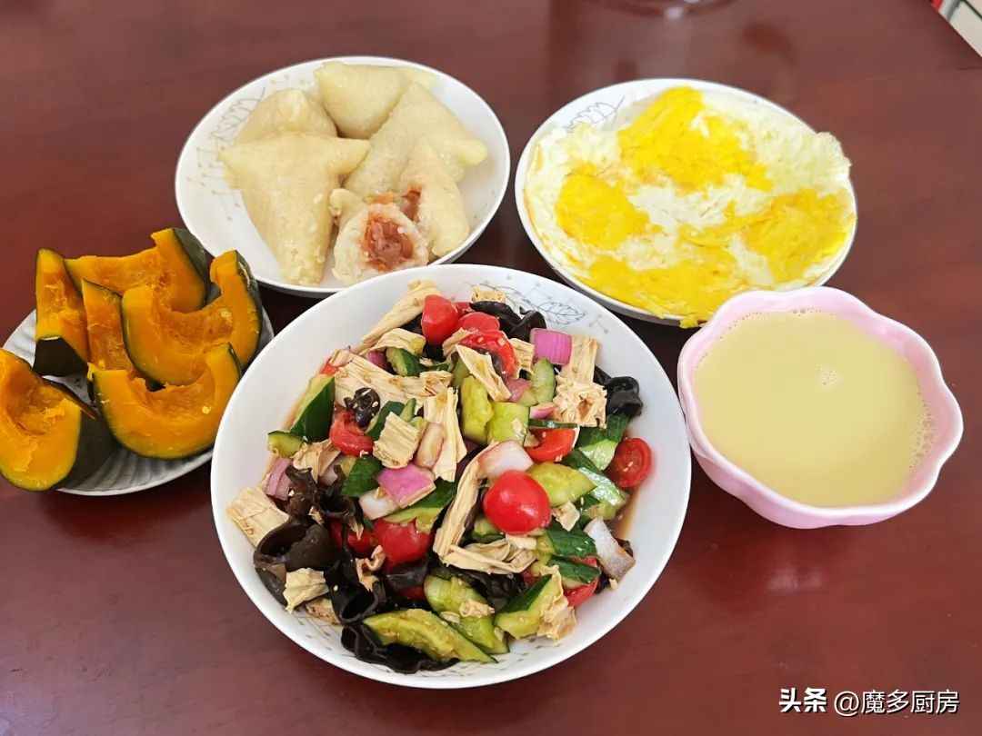 早餐六:胡萝卜山药豆浆、蜜枣粽子、黄瓜木耳拌腐竹、煎鸡蛋、蒸南瓜。
