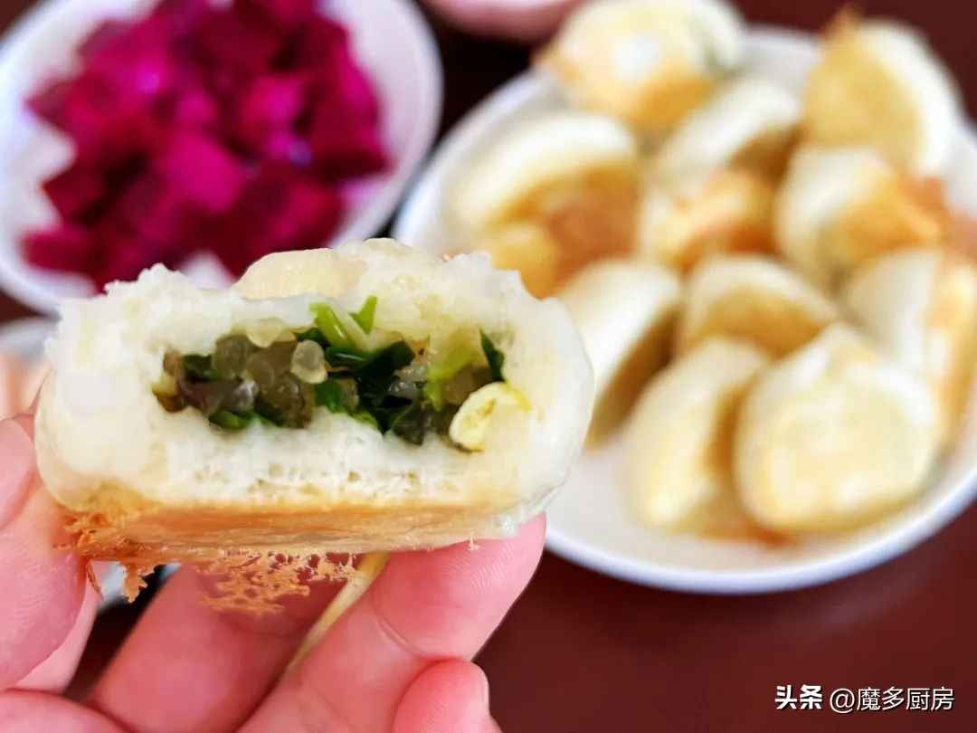 主食是水煎包,孩子爱吃。省时方法有两种:一是睡前准备馅和面团放冰箱,早上包好煎熟;二是提前包好包子生胚冻起来,早上直接煎,照样发得好。