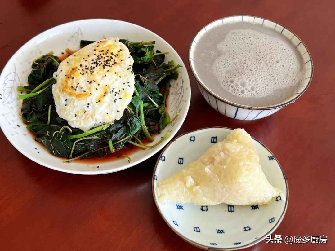 早餐四:红枣黑芝麻豆浆、水煮苋菜、煎鸡蛋、粽子。