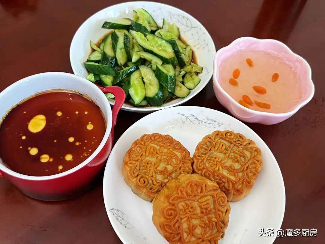 早餐七:枸杞银耳汤、紫火豆沙月饼、蒸鸡蛋羹、拍黄瓜。